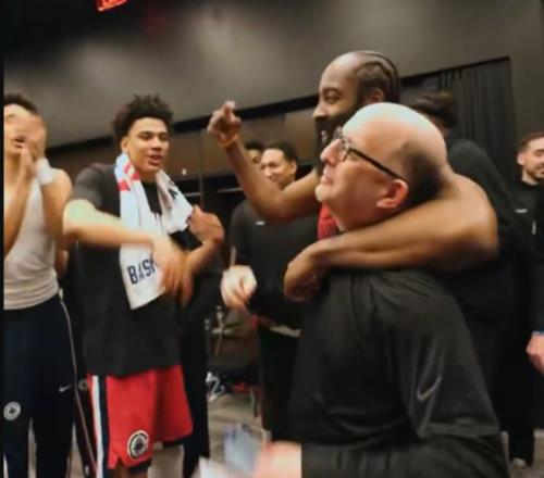 对了,赛后哈登在更衣到带头为助教范甘迪唱起了生日歌