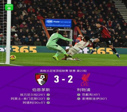 剑南春利物浦客场23遭伯恩茅斯绝杀,索博斯洛伊传射难救主